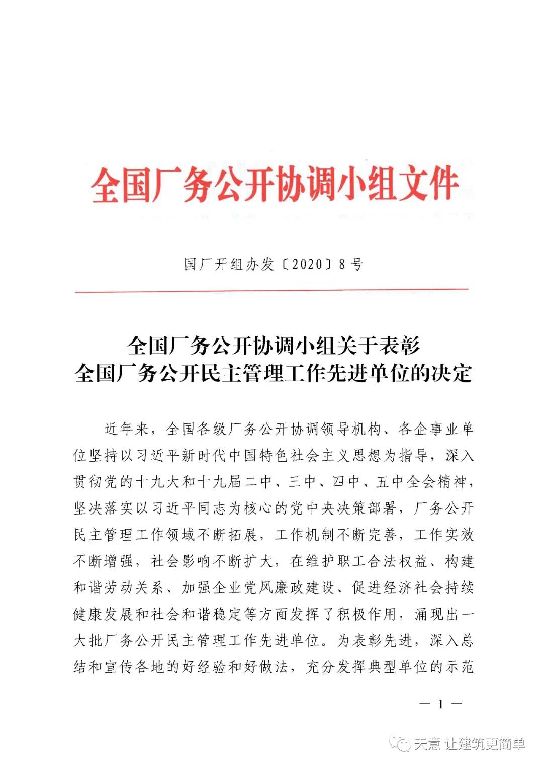 喜訊丨祝賀天意機(jī)械被授予“全國(guó)廠務(wù)公開民主管理先進(jìn)單位”稱號(hào)